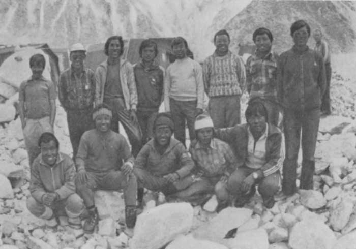 Наши высотные носильщики (слева направо): стоят – Наванг Энден, Лхакпа Циринг, сирдар Пемба Норбу, Падам Бахадур, Нима Дорьи, Дава Норбу, Анг Норбу, Нима Темба; сидят – Пазанг Дава, Пемба Тхунду, Санам Гиальцен, Бидендра, Дава Гиальцен.
