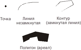 Данные реального мира, отображаемые в ГИС, можно рассматривать с учетом трех аспектов: пространственного, временного и тематического. · Пространственный аспект связан с определением местоположения. · Временной - с изменениями объекта или процесса с течением времени, в частности, от одного временного среза до другого. Примером временных данных служат результаты переписи населения. · Тематический аспект обусловлен выделением одних признаков объекта и исключением из рассмотрения других. В большинстве технологий ГИС используют 2 основных класса данных: · для определения места используют один класс данных - координаты, · для определения параметров времени и тематической направленности, другой класс данных - атрибуты. Координатные данные, составляющие один из основных классов геоинформационных данных, используют для указания местоположения на земной поверхности. Информация о реальном мире частично относится к: - индивидуальным объектам; - пространственному полю каких- либо характеристик. Основные характеристики индивидуальных объектов. В любой модели данных ГИС, имеющей дело с индивидуализированными объектами, должна иметься информация по крайней мере 3-х типов: идентификатор - с индивидуальным объектом должен быть связан его уникальный идентификатор, например, какой то номер (формальный) присваиваемый ему программой в процессе ввода или его номер по какому-то перечню или кадастру; информация положения (локатор) - информация о положении и форме объекта. Она отделена от информации идентификатора; атрибуты - вся остальная информация об объекте. Атрибуты можно подразделить на: 1. - пространственные - периметр и площадь площадного объекта, длина линейного. непространственные - числовые, текстовые значения каких-то величин описывающих объект. . - первичные- измеренные, введенные. - вторичные - рассчитанные, полученные из значений других атрибутов. Геометрически информация, содержащаяся на карте, может быть определена как совокупность наборов точек, линий, контуров и площадей, имеющих метрические значения, отражающие трехмерную реальность. Эта информация образует класс координатных данных ГИС, являющийся обязательной характеристикой геообъектов. Будучи частью (классом) общей модели данных в ГИС, координатные данные определяют класс координатных моделей. В ГИС включают следующие основные типы координатных данных (рис. 1) имеющие различную размерность в геометрическом смысле: точка (узлы, вершины)- 0 длина и ширина, размерность 0; Точечные объекты - это не только точки на карте, но и любые точечные объекты (знаки, города на крупномасштабных картах и т. д.). линия незамкнутая- 0 ширина и не 0 длина, размерность 1; Линейные объекты - ручьи, дороги, линии электропередач, различные коммуникации, которые к тому же могут ветвиться и пересекаться. контур (замкнутая линия); Контуры - линии уровня, дома и другие замкнутые объекты. полигон (ареал, район) (площадные) - группы примыкающих друг к другу замкнутых участков- не 0 длина и ширина, размерность 2. Полигоны - административные районы, кварталы, зоны в приложении к окружающей среде или природным ресурсам и т. д.
