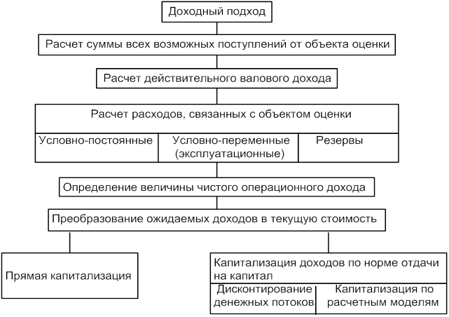 Рисунок 18 - Основные этапы оценки недвижимости доходным подходом 3. Основные понятия и определения Капитализация дохода – процесс, определяющий взаимосвязь будущего дохода и текущей стоимости оцениваемого объекта.