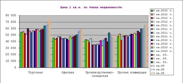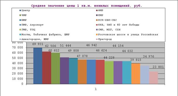 Анализ рынка коммерческой недвижимости г. Краснодара [1] в IV квартале 2012 года (выполнен на основе с айта агенства недвижимости «Краснодарская недвижимость» http://realty.south.ru ) Для определения уровня цен на объекты коммерческого назначения города Краснодара нами были исследованы предложения о продаже зданий и помещений магазинов, офисов, складов, цехов, ресторанов, кафе и т.п., которые были представлены продавцами в IVквартале 2012 года на открытом конкурентном рынке города Краснодара. Самая дорогая недвижимость нежилого назначения расположена в районе Центра: среднее значение цены 1 кв.м. общей площади составило 69 931 руб. На втором месте – район ФМР и ЧМР: среднее значение цены 1 кв.м. равно 62 506 руб. и 60 612 руб. соответственно. Район КМР по уровню цен на нежилую недвижимость занял 3 место: цена 1 кв.м. составила 51 444 рублей. В диапазоне от 44 до 49 тыс. руб. за 1 кв.м. общей площади выставляются на продажу нежилые объекты, расположенные: - ЮМР - 49 808 руб./1 кв.м. - КСК-ХБК-СБС - 47 078 руб./1 кв.м. - ПМР, Аэропорт - 46 942 руб./1 кв.м. - ККБ, ЗИП и 40 лет Победы - 46 624 руб./1 кв.м. - ГМР, ТЭЦ - 44 228 руб./1 кв.м. - СМР, МХГ, СХИ - 44 154 руб./1 кв.м. - Мосты, Табачная фабрика, ШМР - 44 0 руб./1 кв.м.