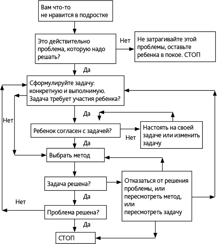 Получается далеко не все и далеко не всегда. Почитать про Бриджит Джонс – так вообще почти никогда ни у кого ничего не получается. На работе мы относимся к этому нормально. А в воспитании почему‑то подавай нам стопроцентный результат! Это нелогично. И моя теория тоже, конечно, работает не всегда. Например, я все‑таки попыталась приучить дочь читать книжки. Она даже согласилась читать две книжки в месяц. Читает она быстро, ей эти две книжки в месяц прочитать ничего не стоит. Но она не последовала договоренности, а у меня не хватило сил это проконтролировать. В результате ничего не вышло, и я пока оставила эту проблему. Не читает книжки – ну и ладно. Зато читает газету. В вопросах, которые не жизненно важны, можно расслабиться и просто отказаться от решения проблемы, если решить ее с первой попытки не удалось. Но бывают вопросы более важные, где отказываться от решения проблемы нельзя. Что же делать, если не получилось? Если вам так и не удалось продержать ребенка разговором те пресловутые пять минут? Если ребенок не следовал договоренностям? Если все‑таки все закончилось скандалом? Во‑первых, успокойтесь, ребенок по‑прежнему жив и здоров. Возьмите тайм‑аут. Может, вы все просто устали жить в обстановке решения проблем? Отвлекитесь. Дождитесь, когда ребенок хоть раз вам дружески улыбнется. И когда обстановка разрядится, подумайте, что вы сделали не так, и начните сначала. Проблема осталась, и ее по‑прежнему надо решать. Может, задача все‑таки была невыполнима? А может, ребенок больше не согласен эту задачу решать? А если задача по‑прежнему выполнима и ребенок с ней по‑прежнему согласен, то, может, был выбран не тот метод? Подумайте и спокойно начните сначала. Время, как всегда, на вашей стороне. Алгоритм – есть алгоритм. Любой, кто хоть когда‑нибудь писал компьютерные программы, знает, что алгоритм должен предусматривать все возможные исходы. В моем алгоритме, если вы столкнулись с нерешенной задачей, есть три возможных выхода: отказаться, хотя бы временно, от решения этой проблемы, пересмотреть метод или пересмотреть задачу.