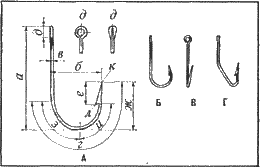 Рис. 3. Крючок: А – устройство крючка; а – длина, б – ширина, а – толщина, г – поддев, д – головка, е – жало, ж – высота поддева, з – затылок, и – лоб, к – острие жала, л – бородка; Б – крючок с загнутым внутрь жалом, В – двугибый крючок; Г – «крутолобый» крючок
