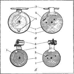 Рис. 8. Катушки для бегучей оснастки: а – проволочная катушка КПП‑65, б – проволочная катушка КПП‑50 с разъемным зажимом («Краб»); 1 – корпус, 2 – кронштейн с лапками, 3 – барабан, 4 – ручки, 5 – стопор обратного хода, 6 – разъемный зажим Поплавочная удочка особенно удобна для ловли с берега, крупных валунов, различных береговых сооружений (волнорезов, причальных стенок, пирсов, набережных). Если же глубина воды нарастает постепенно и требуется забрасывать насадку на большее расстояние, чем это можно сделать удочкой глухой оснастки, применяют бегучую снасть. Для нее нужно удилище с пропускными кольцами и катушкодержателем, на котором устанавливается небольшая, так называемая проводочная катушка с запасом длинной безузловой лески с крючком, грузилом и хлорвиниловой трубочкой для крепления поплавка. Из имеющихся в продаже проволочных катушек для морской ловли более всего подходят модели КПП‑65 и КПП‑50 («Краб») с пластмассовыми барабанами, имеющими стопор обратного хода (рис. 8). Катушка «Краб» снабжена приспособлением для крепления к удилищу. После установки катушки выключают стопор обратного хода (или тормоз‑трещотку), рабочий конец лески протягивают через пропускные кольца, начиная с нижнего, сбрасывают с катушки необходимое количество лески, включают стопор или тормоз и прикрепляют поплавок. В зависимости от местных условий применяют различную оснастку рабочей части лески. Например, для ужения дальневосточной красноперки и черноморских бычков к леске в 10–15 см выше грузила привязывают дополнительный крючок на отдельном поводке. Если глубина на месте ловли превышает 3–4 м, поплавок снимают, к концу лески привязывают утяжеленное грузило (15–20 г), а несколько выше – два‑три крючка на коротких поводках. Грузило опускают на дно. Выбирая место для ужения с берега, опытный рыболов безошибочно определит, какая рыба здесь водится и какую приманку ей предложить. Подходя к месту ловли, рыболов постарается скрыть свое присутствие. Несмотря на непрерывное волнение воды, в известной мере затрудняющее наблюдение, рыбы сразу же заметят рыболова и немедленно отойдут от опасного для них места. Лишь при ловле в мутной воде особых мер маскировки не требуется. Располагаясь на облюбованном месте, рыболов аккуратно раскладывает свои принадлежности, чтобы они не мешали, но были под рукой, чтобы их не смыло водой или не сдуло ветром. Он заранее определяет, куда и каким путем можно уйти, если начнется прилив или сильное волнение. Омываемые морской водой камни и валуны обрастают водорослями, которые при смачивании водой становятся скользкими. По таким камням передвигаются осторожно, чтобы не упасть и не получить травму.