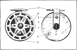 Рис. 20. Инерционная катушка «Невская»: 1 – корпус, 2 – кронштейн с лапками, 3 – барабан, 4 – ручки, 5 – кнопка тормоза‑трещотки, 6 – винт подтормаживателя