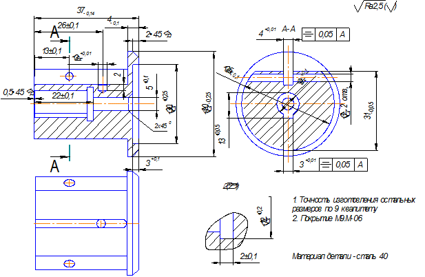 AВ = 0,1, т.к. деталь изготавливается точением, фрезерованием, сверлением и шлифованием – четыре вида обработки резанием. Уточнение Ai, входящее в коэффициент Kс, определяется по формуле (3.11), причем общее количество обрабатываемых резанием точнее 10-ого квалитета поверхностей составляетm= 27. m1 = 0 – поле допуска поверхности №1 принадлежит 9-ому квалитету точности и номинальный размер поверхности лежит в интервале от 30 до 50 мм. Следовательно, оптимальная зона из таблицы для этой поверхности – зона 3. К поверхности №1 предъявлено требование по шероховатости Ra = 2.5 мкм. По параметру шероховатости эта поверхность должна попасть в зону 3. В результате имеем, что поверхность № 5 отстоит от оптимальной зоны на одну зону. Поэтому m5 равен единице. Аналогичные рассуждения для поверхностей № 6, № 7, № 8, № 9, № 10, № 16, № 21, № 22, № 24, № 25, № 26. Поскольку поверхности 7, 8, 9, а также 25, 26 считаются за одну, то на одну зону от оптимальной отстоят всего 9 поверхностей. Для поверхностей №№11,12,13 рассуждения аналогичные рассуждениям для поверхности № 1, только их номинальный размер лежит в интервале свыше 18 до 30 мм. Для них также m11-13 равны 0. Итак: AС = 0,1 × (0 × 12 + 1 × 9 + 0 × 3) = 0,9. В формулу (3.11) для Kc нужно подставить AС = 0.9. Имеем: Kк = 1,0 - AК = 1,0 – 0,0 = 1,0; Kо = 1,0 - AР = 1,0 – 0,2 = 0,8; Kв = 1,0 - AВ = 1,0 – 0,1 = 0,9; K с = 1,0 - AС = 1,0 – 0,9 = 0,1; Тогда: Kсл = 0,25 × (Kк + Kо + Kв + Kс); Kсл = 0,25 × (1,0 + 0,8 +0,9 + 0,1) = 0,7. 3. Показатель точности и шероховатости поверхностей детали Кпов. Для определения этого коэффициента воспользуемся табл. 3.41. Поверхности № 6, № 7, № 8, № 9, № 10, № 16, № 21, № 22, № 24, № 25, № 26 в табл. 3.40 по номинальному размеру и квалитету попадают в зону 4, а их заданная шероховатость Ra =2.5 мкм. Поэтому в табл. 3.40 они попадут в зачерненную клетку. Следовательно, такое сочетание параметров является ошибочным. Должно быть рекомендовано изменение шероховатости в чертеже с Ra = 2,5 мкм на Ra = 1.25 мкм. Все остальные поверхности попадают в зону 3 и их Ra = 2.5 мкм. В табл. 3.40 они попадают в заштрихованную клетку. Поэтому Кпов = 0.8.