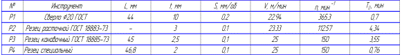 При разработке содержания операций прежде всего уточняют базы - это предопределяет систему простановки размеров, погрешности при изготовлении, схему и конструкцию приспособления для закрепления и т. д. Затем разрабатывают технические требования на операцию, рассчитывают припуски, операционные размеры и допуски на них В ТТ на операцию указывают также допустимые погрешности формы и расположения поверхностей (допуски плоскостности, цилиндричности, прямолинейности, овальности, конусообразности, перпендикулярности, соосности и т.д.). Операцию распределяют на переходы. Напоминаем, что переход характеризуется постоянством применяемого инструмента, обрабатываемой поверхности и режимов обработки. Для каждой операции разрабатывают эскиз, где должна быть изображена заготовка с выделенными обрабатываемыми в этой операции поверхностями, с указанием операционных размеров и допусков поверхностей, шероховатостью, схемой наладок инструментов и их движения, базами, лишающими заготовку шести степеней свободы, номеров инструментов и переходов (рис. 3.22 и 3.23). Инструменты должны изображаться в конечной стадии обработки, т.к. это дает возможность правильно спроектировать его режущие кромки. Для станков с ЧПУ указываются также схемы движения инструментов: БП – быстрый подвод, РХ – рабочий ход, БО – быстрый отвод. На картах наладки вставляется таблица с указанием режимов резания на каждый выполняемый переход (табл. 3.66). При этом номер инструмента в таблице должен соответствовать номеру инструмента на карте наладок. Такими же картами наладок сопровождают операцию в технологическом процессе. Режимы резания указывают в каждом переходе в строчке операционной карты с индексом «Р».