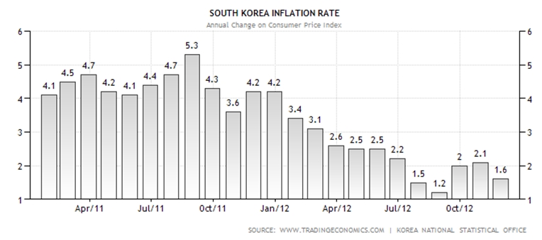 Уровень инфляции в Южной Корее в 2012 г. составил: По данным Bank of Korea и Корейского Национального статистического бюро, максимальный уровень инфляции был зафиксирован в январе 2012г. и составил 4,2%, что на 1,1% ниже, чем максимальный уровень инфляции в 2011 г. (сентябрь 2011г.). Среднегодовой уровень инфляции за 2012 год составил 2,3%. (см. Таблицу №6)