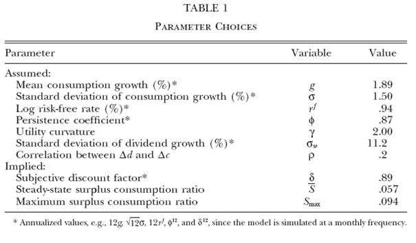 Авторы в своей статье представляют модель, основанную на потреблении, которая охватывает большую часть истории цен на акции из данных о потреблении. Она также объясняет, кратко- и долгосрочные загадки премии к цене акций, несмотря на низкие и постоянные безрисковые ставки. В модели добавляются медленные внешние привычки к стандартной степенной функции полезности. При рассмотрении потребления авторы проводят анализ динамики цен рисковых активов. Добавление в модель привычек генерирует медленные антициклические изменения премии за риск. Эмпирические данные показывают, что существуют сильные связи между рыночными активами и динамикой макроэкономических показателей. Самое главное наблюдение состоит в том, что премии за риск по акциям, оказываются выше на дне бизнес-цикла, чем на пиках. Однако, по мнению авторов, нет успешной теории и процедуры измерения основных источников риска, которые управляют ожидаемой доходностью. В рассматриваемой работе, авторы показывают, что многие вопросы в этой области могут быть объяснены с помощью простой модификации в модели ценообразования активов, основанной на потреблении. И, как уже упоминалось выше, центральным компонентом в модели является медленно изменяемая привычка, добавляющаяся к основной степенной функции полезности. Таким образом, авторы уделяют особое внимание формированию привычек: формирование привычек может объяснить, почему передаваемое потребителями чувство благополучия часто кажется более связанным с недавними изменениями в потреблении, чем с абсолютным уровнем потребления. Спецификации привычек в модели имеют три отличительные черты: · Формирование привычек является внешним, как и в работе Абеля. Потребление индивидов в большей степени зависит от исторического уровня совокупного потребления, чем от собственного. · Привычка медленно движется в ответ на потребление, то есть изменение привычки каждого периода не пропорционально изменению потребления. · Привычка нелинейно адаптируется к истории потребления. Нелинейность сохраняет привычку всегда ниже потребления и сохраняет предельную полезность всегда конечной и положительной. Модель Функциональная форма модели и параметры выбраны таким образом, что безрисковая процентная ставка остаётся неизменной. Выбранные параметры модели представлены в таблице (TABLE 1).
