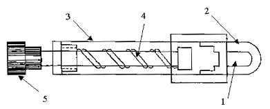 Магнитті кисть: 1 – магнитті стержень (шток); 2 – пластмасса қалпақша; 3 – пластмасса корпус; 4 – пружина; 5- штоктың басы.