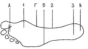 Адам табанының асты: 1 – май табан бөлімі; 2 – аралық бөлім; 3 – өкше бөлімі; А – алдыңғы шеті; Б – сыртқы шеті; В – артқы шеті; Г – ішкі шеті