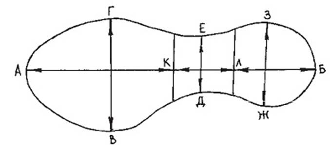 Аяқ киімнің ізін өлшеу: АБ – іздің ұзындығы; АК – табан ізінің ұзындығы; ВГ – табан ізінің еңдігі; ДЕ – аралық бөлім ізінің еңдігі; КЛ – аралық бөлім ізінің ұзындығы; ЛБ – өкше ізінің ұзындығы; ЖЗ – өкше ізінің ендігі
