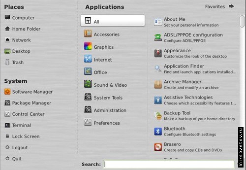 Что нужно пользователю от операционной системы? Функциональность, производительность и укомплектованность. С этой точки зрения Linux Mint удовлетворит требования любого пользователя. Дело в том, что «ось» поставляется сразу с минимально необходимым набором драйверов и программных средств (кстати, список «встроенных» программ изменен, о чем еще поговорим). Доступ ко всему богатству операционной системы осуществляется через преобразившееся меню, которое лично мне напомнило Windows 7.