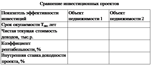 Проекты с максимальной величиной ВСДПр более привлекательны, так как потенциально способны выдерживать большие нагрузки на инвестиционный капитал, связанные с возможным повышением риска. В курсовой работе для расчета показателей эффективности ставку дисконтирования необходимо принять равной коэффициенту капитализации. Показатели эффективности инвестиций в объект недвижимости 1 и 2 рассчитываются по форме табл. 3.3. Таблица 3.3