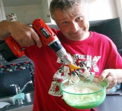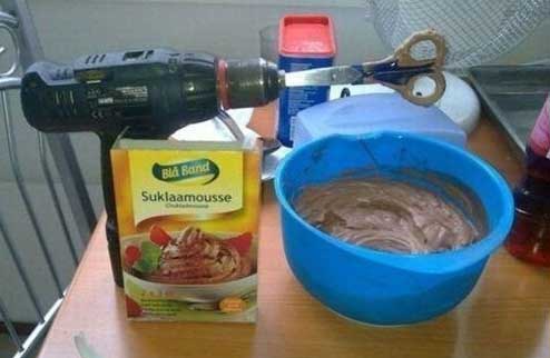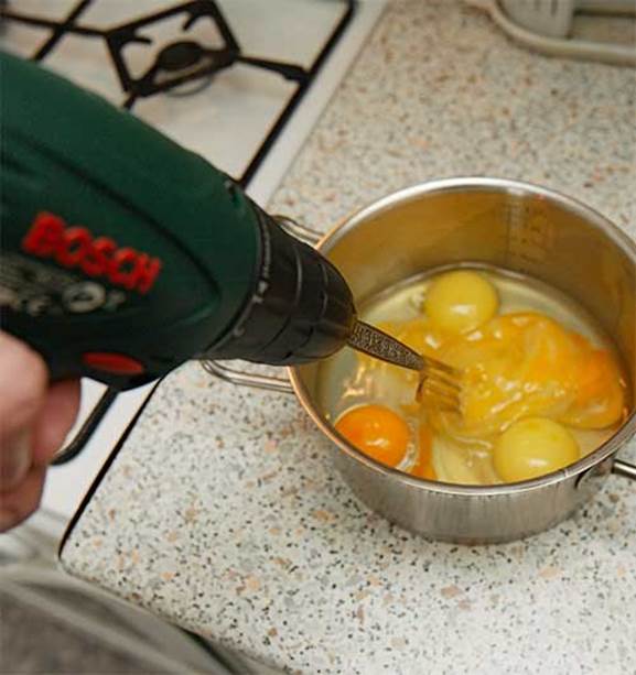 Сегодня у нас лёгкая статья под названием "Нетрадиционное использование дрели" — где мы расскажем о том, как можно использовать столь нужный инструмент не только по назначению. Нетрадиционное использование дрели ни в коем случае не подразумевает нарушения правил из статьи "Техника безопасности при ремонте". При слове дрель мы привыкли представлять себе адскую машину, которой сосед выводит нас из себя каждое утро воскресенья. Но этим инструментом можно сверлить не только стены и доски, он также может быть очень полезен на кухне. Да черт возьми, эта небольшая жужжалка может заменить целый кухонный комбайн! Как использовать дрель в качестве миксера, мясорубки, терки и даже посудомоечной машины, смотрите далее. Большинство сегодняшних советов можно было бы отнести к разделу "Рецепты". И первый способ нетрадиционного использования дрели — это дрель, как миксер. Идея очень проста: вместо сверла вставляется мешалка от миксера. А дальше всё как обычно: мешалку в смесь, включить дрель — и вперёд! Но бывает так, что мешалки от миксера нет. А миксер нужен. Тогда вместо мешалки можно использовать обычный венчик для взбивания яиц: