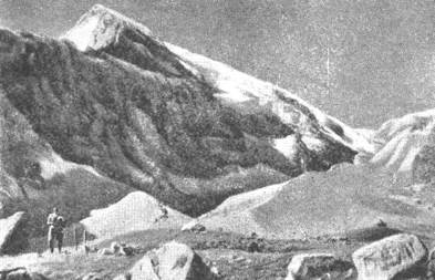 Вершина Большой Ганзы с севера Ночь прошла спокойно, мы проснулись, когда солнце уже освещало левый склон ущелья. Термометр в 7 часов утра показывал +2°С. Ледник, лежавший перед нами, был своеобразен: его тупой язык на высоте примерно 3700 м зарывался в морены; грота не было, и вода скатывалась отдельными ручейками прямо по поверхности чистого белого льда, лишь ниже языка сливаясь в общий прозрачный поток. Несколько ниже ледника из-под правой морены и из ложбинки между мореной и скалами вытекали еще два потока мутно-желтого цвета. Эти три потока почти одинаковой величины давали начало желтой речке, по ущелью которой мы поднимались. Мы пошли вначале по одной морене, старой, плотно сцементированной, но вскоре, дойдя до ледника, перешли на другую,— свежую, грязно-розового цвета, а затем спустились на ледник и по его ровной поверхности быстро пошли вперед.