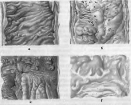 А — мозговидное набухание групповых и солитарных фолликулов, б — некроз солитарных фолликулов и образование грязных язв, в — чистые язвы