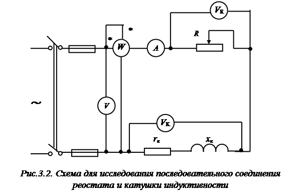 2.1. Исследование цепи, состоящей из последовательного соединения реостата и катушки индуктивности. 2.1.1. Собрать рабочую схему рис.3.2. 2.1.2. Подав напряжение на схему и, выдвигая сердечник из катушки, установить ток в цепи 1-2 А. 2.1.3. Для выбранного значения тока измерить: напряжение на зажимах реостата UR, катушки UK и общее напряжение U, а также потребляемую мощность Р. Результаты измерений занести в табл. 3.1.