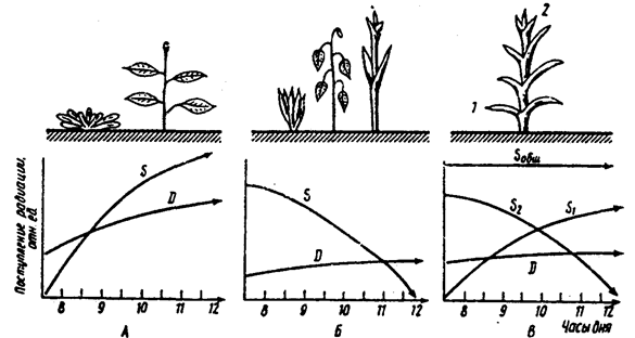 Рис. 5.21. Поступление прямой (S) и рассеянной (Д) солнечной радиации к растениям с горизонтальными (А), вертикальными (Б) и различно ориентированными (В) листьями (по И. А. Шульгину, 1967) 1,2 — листья с разными углами наклона; S1, S2 — поступление к ним прямой радиации; Sобщ — ее суммарное поступление к растению