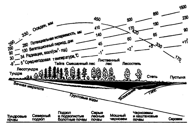 Рис. 5.34. Схема изменения климата, растительности и почв вдоль профиля через основные ландшафты Европейской части России с северо-запада на юго-восток до Прикаспийской низменности (по В. Н. Сукачеву, 1934) Примечание: там, где кривая осадков пересекает восходящую линию испаряемости, расположена граница между гумидным (слева) и аридным (справа) климатом. Черным показан гумусовый горизонт, штриховкой — иллювиальный горизонт