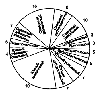 Рис. 5.36. Соотношение площадей суши, занятых различными физико-географическими поясами, в % (по Н. Ф. Реймерсу, 1990)