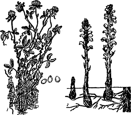 Рис. 5.50. Повилика и заразиха: 1 — повилика клеверная; 2 — заразиха подсолнечниковая