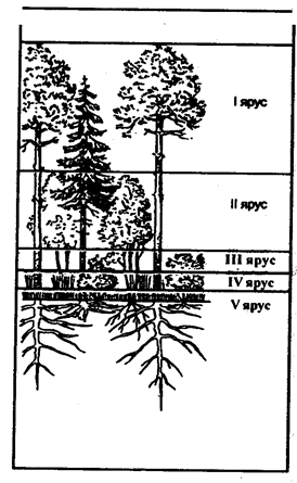 Пространственная структура биоценоза определяется прежде всего сложением его растительной части — фитоценоза, распределением наземной и подземной массы растений. Заселение организмами того или иного биотопа определяется его экологическими факторами, и в первую очередь особенностями атмосферы, горной породы, почвы и ее вод. В ходе длительного эволюционного развития, приспосабливаясь к определенным абиотическим и биотическим условиям, живые организмы так разместились в биоценозе, что практически не мешают друг другу, их распределение носит ярусный характер. Ярусность — это вертикальное расслоение биоцено-зов на равновысокие структурные части. Особенно четко она выражена в растительных сообществах (фитоценозах). Фитоценоз приобретает ярусный характер при наличии в нем растений, которые различаются по высоте. Растения, особенно их органы питания (листья, окончания корней), располагаясь на разной высоте или глубине, легко уживаются в сообществе, что —способствует увеличению числа организмов на единицу площади, ослаблению конкуренции между ними, более полному и разностороннему использованию условий среды. В лесу обычно выделяется пять—шесть ярусов (рис. 11.4).