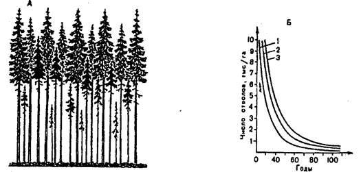 А — господствующие и угнетенные деревья в ельнике; Б — ход изреживания стволов с возрастом у сосны (1), березы (2) и ели (3) (по Г. Ф. Морозову, 1928)