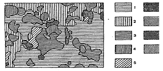 Это особенно отчетливо выражено в лесных биоценозах, где при разреживании древостоя обильно разрастаются кустарники или светолюбивая травянистая растительность. При полном же слиянии древостоя, например в мо-лодняках, может наблюдаться подавление даже теневыносливых трав и мхов. Следует заметить, что не всегда верхний ярус доминирует над нижним. Так, на верховом болоте господствующая роль принадлежит сфагновому покрову. В биоценозе вертикальное распределение организмов обусловливает и определенную структуру в горизонтальном направлении. Расчлененность в горизонтальном направлении получила название мозаичности и свойственна практически всем фитоце-нозам (рис. 11.7).