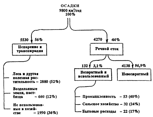Рис. 15.3. Распределение и использование водных ресурсов России (по Т. А. Акимовой, В. В. Хаскину, 1994)