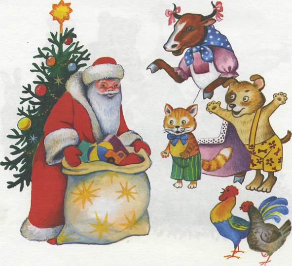 Игра «Что лежит под елкой!» Чему учится ребенок: употреблять в речи имена существительные в творительном падеже с предлогом «под». Оснащение: игрушечная елка, мешочек с подарками. Ход игры: рассмотрите вместе с малышом игрушечную елку. Предложите выделить ее части и назвать их. (Ствол, ветви, иголки.) Спросите ребенка: «Почему люди приносят елку домой?» (Потому что праздник — Новый год.) Попросите малыша закрыть глаза. Положите мешок с подарками под елку. Когда ребенок откроет глаза, попросите его внимательно посмотреть и сказать, что нового появилось под елкой. Обратите внимание ребенка на красивый мешочек, лежащий под елкой. Предложите ему взять этот мешочек, рассмотреть его, развязать на нем красивую ленточку. Затем попросите ребенка вынимать из мешочка подарки по одному и называть их. Попросите ребенка подумать о том, кому бы он их подарил. Предложите ему положить подарок для мамы, папы, бабушки... под елку. Попросите ребенка рассказать о том, что лежит под елкой. «Шоколадка лежит под елкой». Усложнение возможно за счет увеличения количества подарков. Игра «Играем в прятки с Дедом Морозом» Чему учится ребенок: употреблять в речи имена существительные в творительном падеже с предлогом «за». Оснащение: игрушки — елка, дед-мороз, заяц, медведь, белка (или любые другие игрушки по желанию ребенка). Ход игры: предложите ребенку поиграть. Поставьте на стол игрушечную елку. Прочтите рифмовку: Новый год у ворот. Дед Мороз к нам идет, Ребятишек елка ждет, Звери водят хоровод — Веселится весь народ! Предложите ребенку поиграть с дедом-морозом в прятки. Спрячьте всех гостей (зайца, медведя, белку) за елку. Игрушечный дед-мороз подходит к елке и спрашивает у ребенка: «Где же гости?» Ребенок предлагает поискать их. Дед Мороз начинает искать гостей. Предложите ребенку помочь ему. Покажите из-за елки (справа) заячьи ушки. Спросите ребенка: «Где спрятался зайка?» (За елкой справа.) Варианты могут быть различными — справа, слева. Когда дед-мороз найдет с помощью ребенка всех зверей-гостей, предложите всем встать в хоровод вокруг елки и спеть новогоднюю песню. Усложнение возможно за счет увеличения количества гостей.