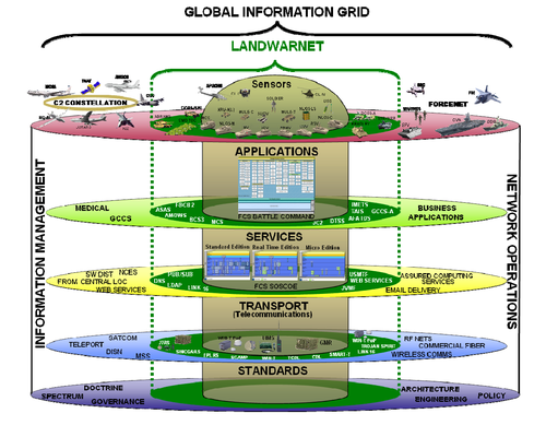 Для реализации подобной глобальной системы необходимо интегрировать не только отдельные компоненты, но и целые системы (система систем). Для этой цели DDS предусматривает простые и эффективные инструменты. Например, чтобы воспользоваться информацией соседней системы нужно «подписаться» на нее в качестве одного из потребителей и распространить эту информацию в своей системе в качестве поставщика данных. Имеются также возможности автоматического преобразования данных в нужный формат (например, перевод из одной системы координат в другую и пр.). Хотя DDS и предоставляет важные средства для подобных систем, но этих средств явно недостаточно. Разработка систем подобного масштаба требует привлечения множества технологий и стандартов. На рис. 28 продемонстрирована многоуровневая архитектура глобальной информационной инфраструктуры армии США.