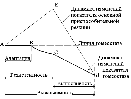 Вернемся к нашему эксперименту. Содержание кислорода в герметически замкнутом пространстве прогрессивно уменьшается. Кислородный гомеостаз нарушается. Развивается фаза декомпенсации, собственная болезнь. Эта фаза, как было указано в лекции о патогенезе, неоднородна. Она состоит из двух периодов – периода относительной недостаточности приспособительных механизмов, периода количественных изменений и периода срыва приспособительных реакций и появление патологических реакций, периода количественных изменений. Способность организма препятствовать срыву приспособительных механизмов, активно сопротивляться, несмотря на действие отклоняющих факторов, и есть второй вид устойчивости. Мы его называем – резистентность. Способность эта, по-видимому, в основном зависит от функциональной подвижности нервных центров, организующих и координирующих работу приспособительных механизмов. Мы измеряем резистентность временем от начала опыта до срыва приспособительных механизмов (в нашем опыте (см.схему) – временем от начала опыта до начала урежения дыхания. Оценка резистентности имеет важное значение для всех отраслей клинической медицины экстремальных условий. Хотелось бы подчеркнуть, что резистентность – это именно активная сопротивляемость. Вряд ли целесообразно, как это делают некоторые авторы, говорить о пассивной резистентности. Вспомните народную песню про ямщика, который замерзал в глухой степи. В первый период фазы декомпенсации при замерзании приспособительные механизмы напрягаются до предела: кожа бледнеет (спазм сосудов), мышцы дрожат. Однако отклоняющее воздействие превышает возможности приспособительных систем – температура тела медленно снижается. После того, как температурный гомеостаз нарушился, возможность сопротивляться зависит уже только от устойчивости приспособительных механизмов. А они имеют свой предел работоспособности и при продолжающемся воздействии холода срываются: кожа приобретает синюшный оттенок (сосуды расширяются), мышцы расслабляются. После срыва основных приспособительных механизмов в период качественных изменений фазы декомпенсации жизнеспособности организма может сохраняться еще очень долго. Свойство организма, несмотря на действие отклоняющих факторов, сохранять жизнеспособность после срыва основных приспособительных механизмов мы называем выносливостью. Выносливость является третьим видом НУ. В отличие от резистентности это пассивная устойчивость. От чего она зависит, пока сказать трудно. Тут нужны глубокие биохимические исследования. Чтобы измерить выносливость, нужно зарегистрировать время от начала срыва приспособительных механизмов до гибели животного (в нашем опыте см. схему) – время от начала урежения дыхания до его остановки). Оценка выносливости важна при выведении организма из состояния клинической смерти, при тяжелом травматическом шоке, в условиях наркоза и гипотермии. Югославские исследователи Энджюс и Хозич восстанавливали нормальную жизнедеятельность сусликов после 7-часового пребывания их в состоянии глубокой гипотермии (при температуры тела 0 0С), когда приспособительные системы организма были полностью парализованы. В опытах С.А.Мельникова продолжительность жизни у новорожденных крысят, несмотря на быстрый срыв приспособительных мех