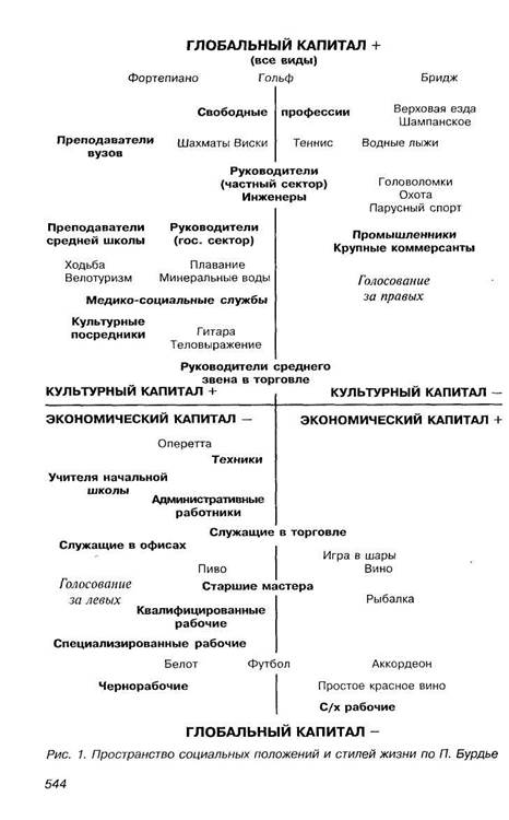 542 В социологии неоднократно предпринимались попытки выделить наиболее значимые номинальные и ранговые параметры, определяющие положение индивида в социальном пространстве. Так, американский социолог П. Блау считал, что к номинальным параметрам в современном обществе можно отнести пол, расу, этническую принадлежность, вероисповедание, место жительства, область деятельности, политическую ориентацию, язык, а к ранговым — образование, доход (заработную плату), богатство (наследство или накопление), престиж, власть, происхождение, возраст, административную должность, интеллигентность*. Однако любой перечень параметров социального пространства будет неполным, потому что социальная жизнь очень многообразна, подвижна, в ней постоянно возникают новые факторы, влияющие на положение людей в социальном пространстве, а главное — по мере развития общества может происходить перерастание некоторых ранговых параметров в номинальные, и наоборот. Так, в патриархальном обществе тендерная принадлежность является ранговым параметром, а в современном обществе — номинальным; то же можно сказать о расовой принадлежности в США в XIX в. и в настоящее время. По мнению французского социолога П. Бурдье, положение человека в социальном пространстве в конечном итоге определяется двумя основными дифференцирующими параметрами: а) «объемом капитала», т.е. совокупностью определенных статусных, символических, экономических, политических, культурных и других ресурсов, которыми он обладает; б) «структурой капитала», т.е. относительным объемом различных видов капитала. На рис. 1 показано пространственное положение представителей различных социо-профессиональных групп в обществе в зависимости от общего объема капитала и обладания культурным и экономическим капиталом. § 3. Основания социальной стратификации Теории, призванные в рамках социологии дать научное объяснение основным принципам иерархического строения общества, называются теориями стратификации. Термин «стратификация» происходит от латинского stratum — слой, пласт и fatio — делаю. Таким образом, в этимологии слова заложена задача не просто выявить групповое многообразие, а определить вертикальную последовательность положения социальных слоев, пластов в обществе, их иерархию. Некоторые авторы нередко заменяют понятие «стра-