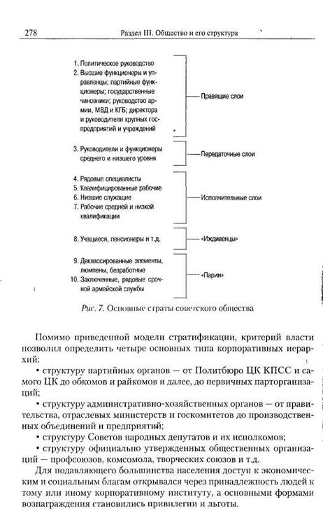 Однако социальная стратификация российского общества не может быть ограничена только группировкой населения в рамках элиты, среднего класса и беднейших слоев. В отечественной литературе последних лет предлагаются иные модели стратификации. Одна из них принадлежит В.В. Радаеву и О.И. Шкаратану1. В ее основе — властная (этакратическая) иерархия и классовая структура. Этакратчешя модель социальной стратификации При рассмотрении властной иерархии авторы этакратическои модели опираются на собственный анализ стратификации советского и постсоветского общества. Они считают, что система советского типа представляет собой общество без классов. В этой системе были ликвидированы (насильственным путем) дореволюционные классы, произошла атомизация общества (оно превратилось в совокупность статистических групп, за исключением правящих слоев), нарастали процессы социальной маргинализации (т.е. имело место расхождение между социокультурным происхождением групп и их нынешним общественным положением). В таких условиях, полагают Радаев и Шкаратан, основным критерием социальной стратификации становится распределение власти. Однако власть трудно поддается формализации. Для того чтобы стратифицировать советское общество по этому критерию, авторы воспользовались системой рангов, определяющих положение каждого индивида по месту, формально занимаемому им в общественной иерархии. Ранжирование — это элемент жесткой социально-дифференцирующей политики. Из всей совокупности формальных рангов Радаев и Шкаратан выделили социально-профессиональные2 и на их базе выстроили схему основных страт советского общества (рис. 7). 216. 1 См.- Радаев В В, Шкаратан О.И Социальная стратификация М., 1995. С. 197— Там же С 203.
