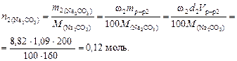 Пример 3. Какой объем воды следует прибавить к 500 мл раствора, содержащего 40 г сульфата никеля, чтобы понизить его концентрацию до 0,05 моль/л? Решение. 1. По уравнению (36) найдем объем 0,05 М раствора (V 2): 2. Найдем объем воды: Пример 4. Найти молярную концентрацию раствора карбоната натрия, полученную при смешивании 600 мл 2,15 % раствора (d = 1,02 /см3) и 200 мл 8,82 % раствора (d = 1,09 г/см3). Решение. 1. Найдем количество вещества карбоната натрия в каждом из смешиваемых растворов:
