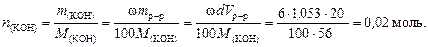 2. Вычислим молярную концентрацию полученного раствора: Пример 5. Какой объем раствора серной кислоты концентрацией 0,42 моль/л потребуется для нейтрализации 20 мл раствора гидроксида калия концентрацией 6 % (d = 1,053 г/см3)? Решение. 1. Составим уравнение реакции: 2KOH + H2SO4 ® K2SO4 + 2H2O 2. По уравнению (34) найдем количество вещества KOH