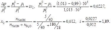 из уравнения (41) вычислим давление пара серебра р 1 над расплавом: Пример 4. Давление насыщенного пара над раствором, содержащим 5 г едкого натра в 180 г воды, при 100ºС составляет 0,99·105 Па. Давление насыщенного пара над чистой водой при 100ºС составляет 1,01·105 Па. Определить состояние едкого натра в растворе. Решение. Состояние едкого натра в растворе можно оценить по величине изотонического коэффициента i. По закону Рауля: