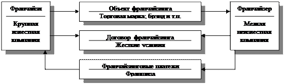 Рис. 1.9. Схема лизинга Франчайзинг - смешанная форма крупного и мелкого предпринимательства, объединяющая элементы аренды, купли-продажи, подряда, представительства. Объектом франчайзинга может быть торговая марка, технология производства, эксклюзивные права и т.п. (Рис. 1.10.).