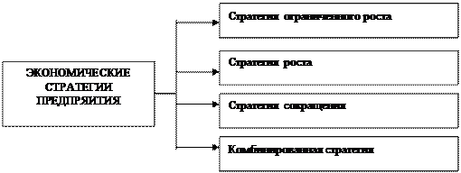 Анализ внешней среды представляет собой оценку состояния и перспектив развития, важных для организации факторов окружающей среды, экономических, социальных, политических, географических и т.п. Анализ проводится на макро- и микро- уровнях. На макро уровне анализируются политические условия, международные процессы, социально-культурные факторы. На микро уровне анализируются конкуренты, поставщики, покупатели. Анализ внутренней среды заключается в оценке системы управления на предприятии, специфики производства, квалификации персонала, финансовых возможностей, организационной культуры. Результатом анализа внутренней и внешней среды становится выявление конкурентных преимуществ, т.е. определение направлений, реализация которых позволит предприятию добиться превосходства над конкурентами. Определив свои преимущества, предприятие определяет и формулирует главную цель. Затем эта цель уточняется и детализируется. В итоге цель формулируется просто и четко в удобной для восприятия форме. Правильно сформулированная цель предопределяет выбор конкретного варианта стратегии. Все действия по выбору стратегии должны приводиться на системной основе: с учетом долговременных целей, с увязкой по ресурсам и времени. К настоящему времени учеными систематизировано четыре базовые экономические стратегии (Рис. 10.2.)