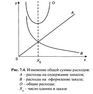 Из рис. 7.4. следует, что минимальные расходы будут получены при Х = Хо. Составим уравнение, определяющее общую сумму затрат: 1. Среднее число единиц, составляющих запасы, равняется X, где Х - число единиц, соответствующих одному заказу. 2. Средний запас в денежном выражении составляет СХ, где С - стоимость единицы изделий данного наименования. 3. Общая сумма затрат на содержание запасов составляет