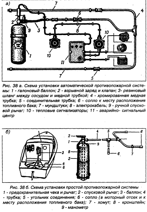 Осушительная система - система для периодического удаления небольшого количества воды из корпуса. Вода собирается в колодцах, расположенных в самых низких местах корпуса, из которых насосами откачивается либо за борт, либо в резервуары для приема льяльных вод. Осушительная система состоит из насоса с механическим приводом и (или) насоса с ручным приводом, который может быть переносным. Осушительными средствами должно быть обеспечено каждое маломерное судно, находящееся в эксплуатации. Все осушительные средства следует хранить в специально отведенных для них легкодоступных местах и содержать в полном порядке и готовности к немедленному действию. Запрещается использовать их не по прямому назначению. В качестве осушительного насоса разрешается использовать пожарный, балластный или водоотливной насос. Применять осушительный насос для сбора подсланцевых нефтесодержащих вод нельзя. Противопожарная система (средства).. Для предупреждения пожара и тушения их, на маломерных судах предусматривается наличие противопожарных сигнализационных устройств, стационарных систем и переносных средств пожаротушения, автоматически срабатывающих огнетушителей. Основными причинами возникновения пожаров на маломерных судах является возгорание топлива при его потеках или подсланевых вод в трюмах, покрытых пленкой бензина с достаточно большим слоем его паров в отсеке при отсутствии вентиляции Сигнализационные устройства подают сигнал на пост управления судном при пожароопасной концентрации паров топлива в замкнутом пространстве (моторном отсеке), либо делают невозможным пуск двигателя в этих условиях (при блокировке с устройством запуска двигателя). В наиболее распространенной и эффективной стационарной системе пожаротушения (рис. 38 а, б) применяется двуокись углерода или галон - жидкость, либо сжиженный газ. Включение системы предусматривается из рубки вручную или автоматически (от датчиков в возможных очагах пожара