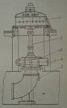 Рис.5. Установка вертикального насоса типа В: 1-электродвигаетль, 2-трансмиссия, 3-корпус насоса, 4-напорный патрубок, 5-входной патрубок. Затем приступают к центровке агрегата по вертикальной оси струной и отвесом. За базу принимают уплотняющее кольцо корпуса насоса (рис.6). Струну натягивают через центр насоса и статора. Зазоры между струной и уплотняющим кольцом насоса замеряют штихмассом электроакустическим методом. Он состоит в том, что цепь с радионаушниками и источником тока в виде батарейки для карманного фонаря одним концом присоединяют к струне, а другим концом к раме (или цилиндрам). При замерах соосности один конец штихмасса устанавливают на обработанную поверхность рамы или цилиндра и подбирают его длину, при которой второй конец легко касается струны. В момент касания цепь замыкается и в наушниках слышен треск. Расстояние до струны считается замеренным правильно, если уменьшение длины штихмасса на 0,02мм не дает контакта в цепи наушников. Несоосность рамы и цилиндра не должна превышать 0,15–0,2мм. После предварительной центровки насоса и статора подливают бетонной смесью фундаментные болты, а когда бетон затвердеет, агрегат центруют окончательно. Допустимые отклонения по соосности не должны превышать 0,03–0,05мм. Ротор насоса устанавливают на нижнюю крышку корпуса. После этого ставят верхнюю крышку насоса с вкладышами подшипника и предварительно выверяют вертикальность вала насоса равным уровнем; допустимое отклонение от вертикали не более 0,04мм на 1м. указанной точности добиваются путем установки в зазор между шейкой вала и вкладышами подшипника полуколец, заранее изготовленных из металлических пластин толщиной 0,1–0,4мм. После предварительной выверки вертикальности вала монтируют трансмиссии. Затем собирают электродвигатель и проверяют зазоры межжелезного пространства между ротором и статором вверху и внизу в четырех диаметрально противоположных точках. Зазоры (рис.7) не должны превышать ±10% проектного размера. Несоосность ротора по отношению к статору можно устранить передвижением вала ротора по сегментам подпятника опорного подшипника с помощью прижимных болтов.