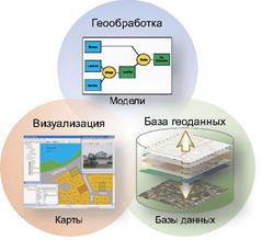 Географическая информационная система (ГИС) - это система для управления географической информацией, ее анализа и отображения. Географическая информация представляется в виде серий наборов географических данных, которые моделируют географическую среду посредством простых обобщенных структур данных. ГИС включает наборы инструментальных средств для работы с географическими данными. Географическая информационная система поддерживает несколько видов для работы с географической информацией: 1. Вид Базы Геоданных: ГИС - это пространственная база данных, содержащая наборы данных, которые представляют географическую информацию в контексте общей модели данных ГИС (векторные объекты, растры, топология, сети и т.д.) 2. Вид Геовизуализации: ГИС - это набор интеллектуальных карт и других видов, которые показывают пространственные объекты и отношения между объектами на земной поверхности. Могут быть построены разные виды карт, и они могут использоваться как “окна в базу данных” для поддержки запросов, анализа и редактирования информации. 3. Вид Геообработки: ГИС - это набор инструментов для получения новых наборов географических данных из существующих наборов данных. Функции обработки пространственных данных (геообработки) извлекают информацию из существующих наборов данных, применяют к ним аналитические функции и записывают полученные результаты в новые производные наборы данных. В программном обеспечении ESRI® ArcGIS® эти три вида ГИС представлены каталогом (ГИС как коллекция наборов геоданных), картой (ГИС как интеллектуальный картографический вид) и набором инструментов (ГИС как набор инструментов для обработки пространственных данных). Все они являются неотъемлемыми составляющими полноценной ГИС и в большей или меньшей степени используются во всех ГИС-приложениях.
