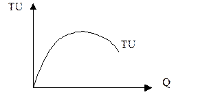Поведение потребителя определяется его оценкой полезности экономических благ, т. е. тех благ, которые имеются в ограниченном количестве в сравнении с потребностью в этих благах, и их редкостью. Под полезностью понимается способность благ удовлетворять потребности. Под редкостью понимают частоту появления каких-либо благ в единицу времени в распоряжении потребителя. Различают общую и предельную полезность. Общая полезность (TU – total utility) – это общее удовлетворение или суммарная польза, которую получают люди от потребления определенного количества благ. Общая полезность возрастает с увеличением количества благ, но с ростом количества благ полезность каждой последующей единицы блага становится меньше, т. е. полезность благ есть функция их количества: TU = f (Q) Графически эту зависимость можно представить на рис. 7: