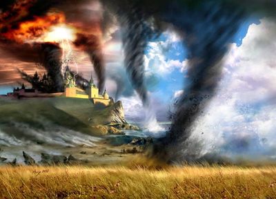 Это образное описание Смерча. Он круглый, как Змей, да размером с гору - Горыныч поэтому. Вот она - громовая туча с тремя хоботами смерча. Меч, конечно же, не сечёт головы Змея Горыныча. А наши Предки знали, что лишь кованая рукавица, или шапка, или щит могут снести голову Змею, т.е. перекрыть потоки энергии смерча. Только такие широкие и плоские предметы наших витязей, как щит способны нарушить систему восходящих и нисходящих потоков смерча, чем прекращают его действие. Как правило, это деяние сопровождалось своеобразным звуком «Ух», что и получило в сказках выражение: «И испустил Дух». И только позже появились бездумные сюжеты, где Иваны-царевичи одним мечом лихо срубают головы Горынычам, очередной раз «упростив» и лишив смысла эти сказки.