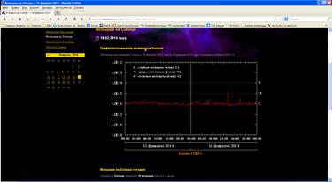 Возьмем, к примеру, известные события на Украине, которым уделяется столько внимания в последнее время. Мы специально их не считали, поскольку работы своей и так хватает. Однако чисто из академического интереса могли бы предоставить определенные выкладки для сравнения составленных прогнозов и реальных событий. Несколько примеров. С начала процесса хаотизации (ноябрь месяц 2013 года) было интересно посмотреть, как будут развиваться события в соседней стране. Была прослежена вероятность усиления активности (повышательная волна) в середине января и в середине – третьей декаде февраля, когда система должна была переходить в состояние неустойчивого равновесия. Помимо коротких и длинных циклов производился учет внешних факторов, способных инициировать процессы в условиях повышательных волн активности. Аналитики в своих расчетах, к слову, концентрируясь на чисто политических моментах не учитывали множество на первый взгляд сторонних факторов. Ни в одной работе, например, не принималась во внимание аномально высокая солнечная активность осени 2013 – зимы 2014 годов. Расчет фактора солнечной активности также представляется сложным делом, где следует смотреть на количество пятен, их расположение, скорость выброса корональной массы и т.д. Здесь мы просто покажем несколько картинок, взятых со специализированных сайтов: