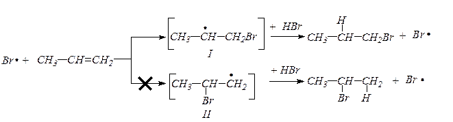 Наличие в молекулах алкенов двойной связи, состоящей из Естественно ожидать, что реакции алкенов будут проходить по двойной связи, а следовательно, будут реакциями присоединения, а не реакциями замещения, характерными для ранее рассмотренных алканов. 1. Присоединение водорода. Присоединение водорода к алкенам приводит к образованию предельных углеводородов: СН3-СН=CH2 + Н2 2. Присоединение галогенов. Галогены присоединяются к алкенам с образованием вицинальных дигалогенпроизводных, т. е. содержащих атомы галогена у соседних атомов углерода. На первой стадии этой реакции происходит взаимодействие между [R-CH=CH-R --- Cl I II III 3. Присоединение галогенводородов. Галогенводороды присоединяются к алкенам с образованием галогеналкилов. Присоединение в случае несимметричных молекул идет по правилу Марковникова, т. е. водород присоединяется к наиболее гидрогенизированному атому углерода (с наибольшим числом водородных атомов): R-CH=CR2 + HBr Эта реакция, как и присоединение брома к этилену, идет после образования [R-CH=CR2 --- Н В присутствии перекисей бромистый водород присоединяется не по правилу Марковникова (эффект Хараша). В присутствии перекисей реакция идет не по механизму электрофильного присоединения, как выше, а по радикальному механизму (Xapaш). Первой стадией является атака перекисного радикала на молекулу HBr: RCOO• + HBr Возникший радикал брома может присоединяться к алкену с образованием новых радикалов I и II, в связи с чем, реакция должна протекать по двум направлениям: