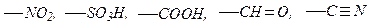 Заместители I рода направляют любой новый заместитель в орто- и пара -положения по отношению к себе. При этом все они (за исключением галогенов) уменьшают прочность ароматической группировки и облегчают реакции замещения. В содержащих заместители I рода производных бензола водородные атомы ядра замещаются с большей скоростью, чем в самом бензоле. Отличительная особенность приведенных выше заместителей I рода — наличие в них только простых связей. б) Заместители II рода. К ним относятся, главным образом, остатки кислот: нитрогруппа, сульфогруппа и карбоксильная группа, а также альдегидная и нитрильная группы, т. е.