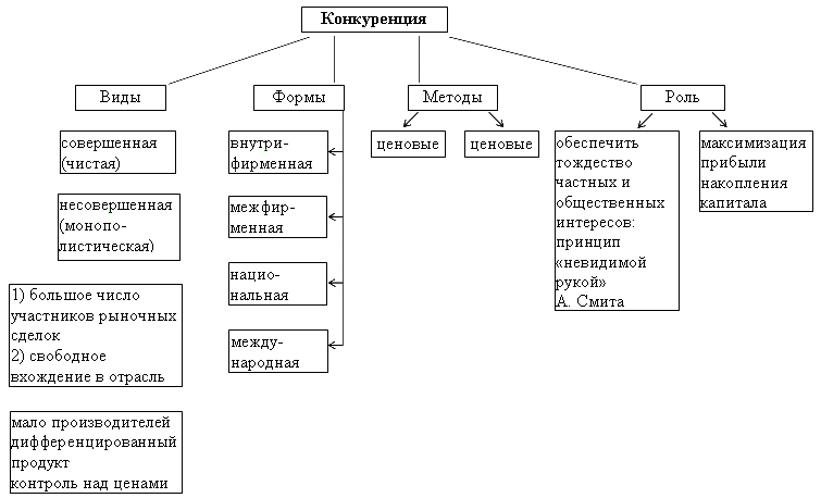 Конкуренция ¾ это экономическое соперничество между фирмами с целью достижения поставленной цели. Например, в спортивных соревнованиях каждый человек или команда стремится завоевать первое место ¾ получить приз. И это нормально. Точно так же в экономике: каждый производитель или группа производителей хлеба, кроссовок, зубной пасты, жвачки и т. д. хочет победить других. А как победить в экономике? Ответ: при одинаковых расходах получить лучший результат ¾ больше прибыли. Получишь больше прибыли ¾ считай, что это своего рода победа. Экономисты различают два вида конкуренции: совершенную (чистую) и несовершенную (монополистическую) (см. схему 3.4).