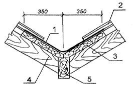 1 - морозостойкая резина с продольными желобками для стока воды или кровельная оцинкованная сталь; 2 - цементно-песчаная черепица; 3 - сплошные участки обрешетки; 4 - стропильная нога; 5 - продольный брус.